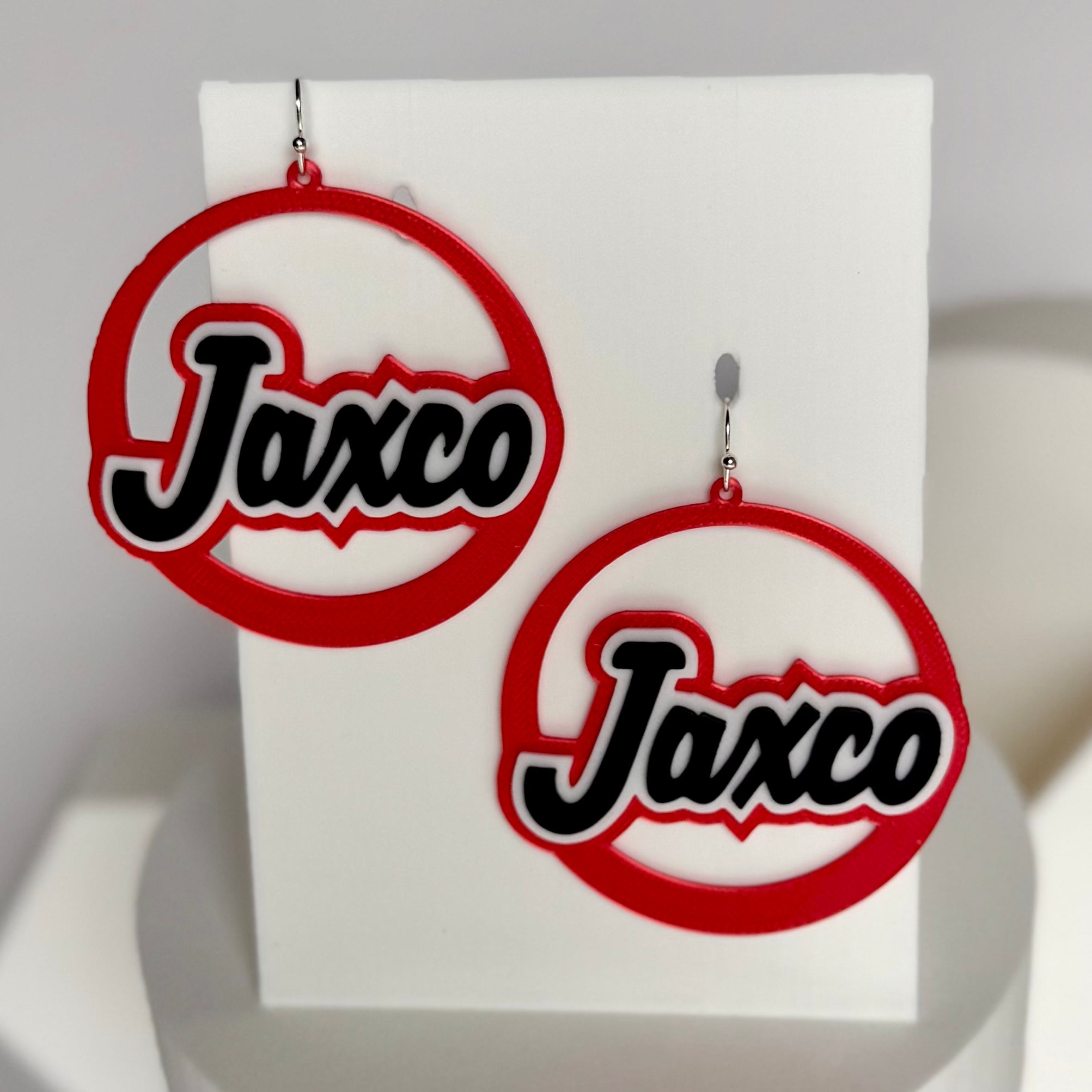Rep the Jackson County Panthers with these bold Jaxco hoop earrings! Featuring the “Jaxco” script in black and white on a red hoop base, these earrings are a fun and stylish way to show off your Panther pride.